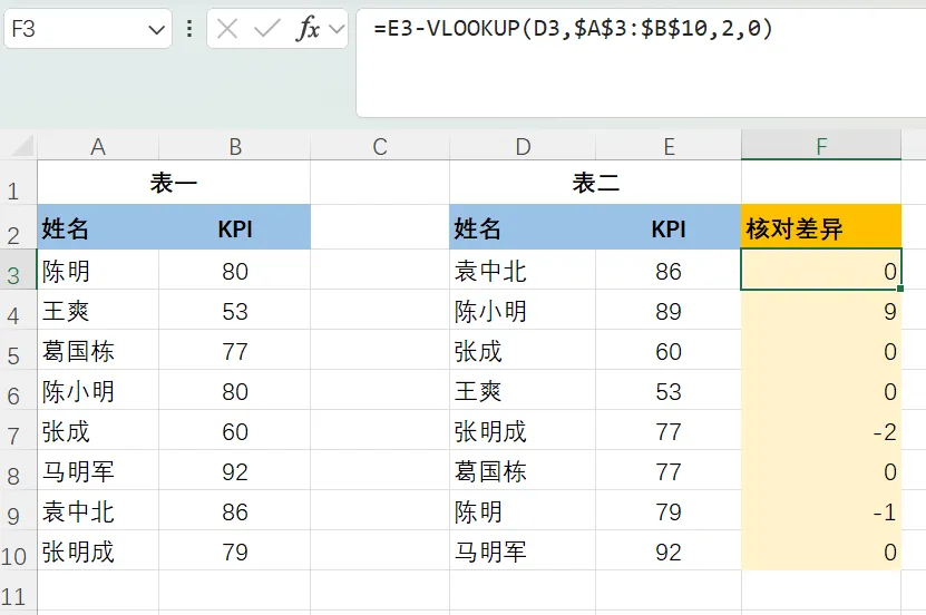 通过员工工号反向查找员工姓名,我们可以将公式设置为:=VLOOKUP(F2,IF({1,0},B2:B9,A2:A9),2,0)。当我们需要核对两张顺序错乱且有数据不同的KPI表,可以怎么做?通过设置函数公式=E3-VLOOKUP(D3,$A$3:$B$10,2,0)。如果结果为0,说明数据相同;如果不为0,结果就为差异值。=VLOOKUP("*"&D2&"*",A2:B9,1,0)