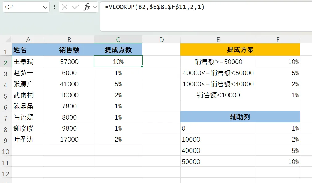 =VLOOKUP(B2,$E$8:$F$11,2,1)