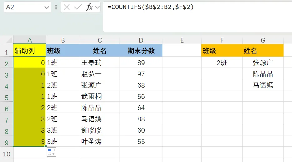 当需要从一个数据表中提取多个匹配项(如班级的所有同学),可结合ROW函数生成递增查询值。这里我们要先生成一个辅助列,查找班级在表格中出现的次数,公式如下:=COUNTIFS($B$2:B2,$F$2)