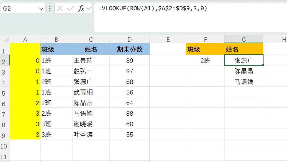 生成统计次数之后,我们就可以结合Row函数查询到所有都是2班同学的名字,公式如下:=VLOOKUP(ROW(A1),$A$2:$D$9,3,0)