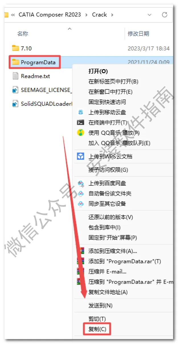 2.打开刚刚解压的文件夹,双击打开“Crack”文件夹,鼠标右键点击“ProgramData”选择“复制”