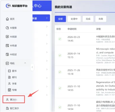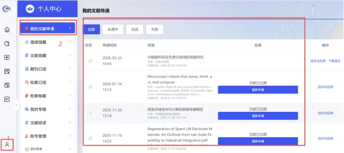 文献传递并截图:将文献传递至邮箱,截图个人中心我的文献申请页面。
