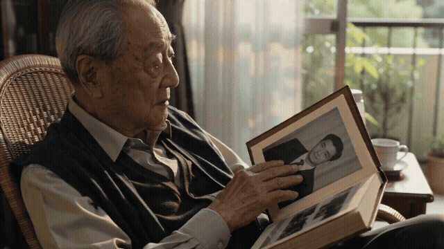 固定机位,近景,画面保持静止不动。老人坐在藤椅上翻看一本泛黄的相册,手指轻轻抚过照片上的面孔,阳台午后的阳光斜斜地照在他满是皱纹的手上,温暖怀旧的色调,生活纪实感