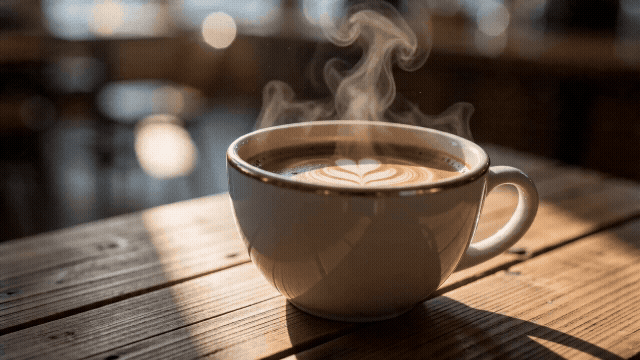 固定机位,特写,画面保持静止不动。一杯刚倒好的手冲咖啡放在原木桌上,表面的油脂光圈缓缓扩散,蒸汽袅袅升起在逆光中清晰可见,侧面窗光,咖啡馆氛围,广告质感。