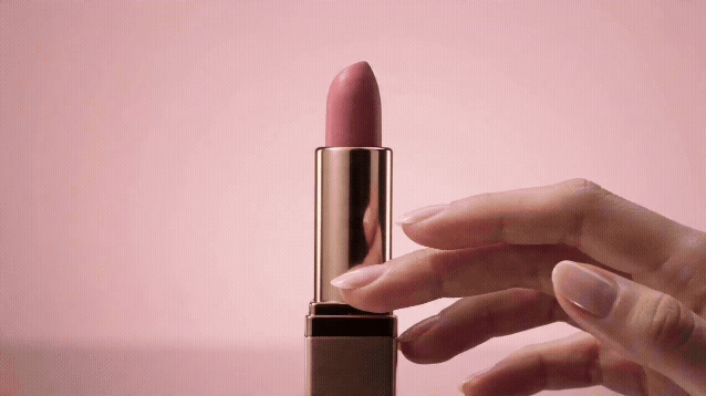匀速推镜头,画面从中景向前推进至微距特写。一支口红缓缓旋转露出膏体,随着画面靠近逐渐看清膏体表面细腻的丝绒纹理和微闪光泽,背景完全虚化只剩一片柔和的粉色光晕,奢侈品广告质感。
