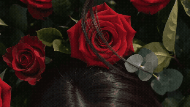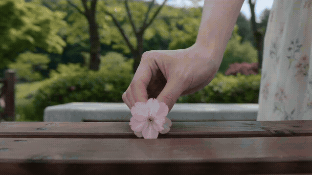 拉镜头,画面从一只手在桌子上轻轻放下一朵花的特写向后缓缓退开。随着画面拉远,逐步揭示出这是一个公园石凳前站着的一个女生,再远一些是一整片公园被春天的氛围覆盖,最终画面变为航拍俯视这片宁静的山坡。