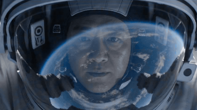 拉镜头,画面从宇航员头盔面罩的特写向后缓缓退开。面罩上反射着蓝色星球的倒影,随着画面拉远逐步揭示出他正独自漂浮在无垠的太空中,远处是缓慢旋转的空间站残骸,最终画面变为广阔的星空全景中一个渺小的人影,孤独与壮美并存。
