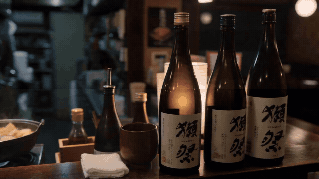 水平摇镜,画面从右向左缓慢平移。依次扫过日式居酒屋的吧台全景:陈列整齐的清酒瓶、冒着热气的关东煮锅、正在切刺身的老板娘专注的侧脸,最终停留在一位独坐角落小酌的年轻人身上,暖色灯光配合木质装修,深夜食堂氛围