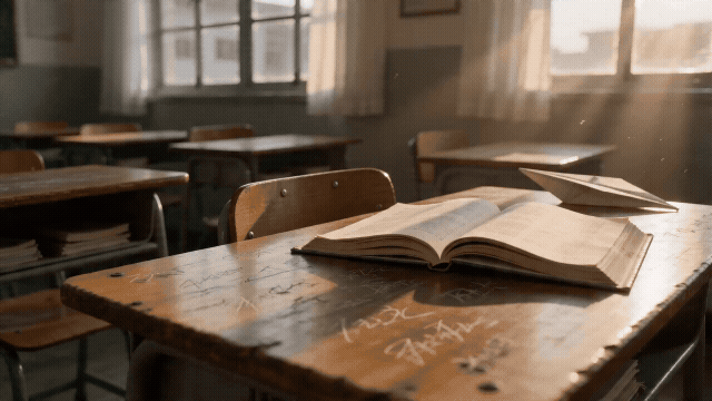 水平摇镜,画面从左向右缓慢平移。依次扫过老教室的课桌:刻满字的桌面、翻开的课本、一个纸飞机、被风吹动的窗帘,最终停留在黑板上用粉笔写的"毕业快乐"四个字,午后阳光透过窗户洒满教室,怀旧青春感。