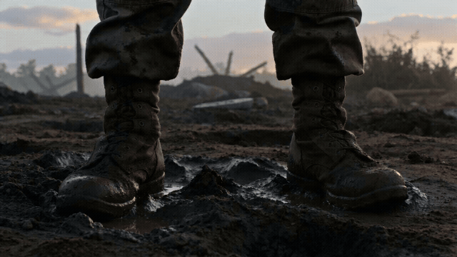 垂直向上摇镜,画面从地面的一双沾满泥巴的军靴缓缓向上移动。依次经过磨损的迷彩裤腿、挂着水壶的腰带、沾着灰尘的防弹背心、下巴上的胡茬,最终停在一双疲惫但坚毅的眼睛上,逆光剪影边缘泛着金色光晕,战争片质感。