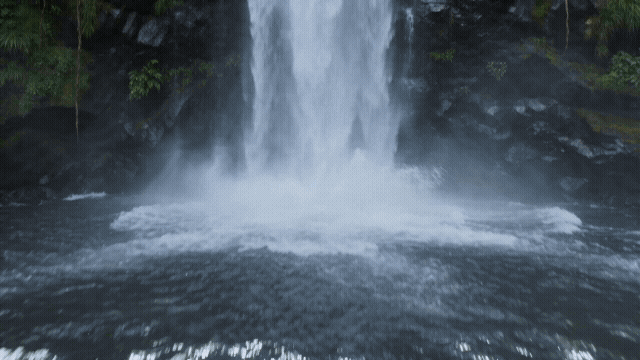 垂直向上摇镜,画面从瀑布底部的水潭溅起的白色水花缓缓向上移动。依次经过飞流直下的水帘、布满青苔的岩壁、崖壁上生长的野花和藤蔓,最终停在瀑布顶端天空中一道彩虹横跨两岸,阳光穿透水雾形成丁达尔光线,自然纪录片质感。