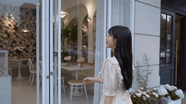 跟随镜头,画面从侧后方紧跟女孩同步移动。她走进一家开满鲜花的甜品店,推开玻璃门后满目粉白色系的花墙和展示柜映入眼帘,她边走边好奇地张望着橱窗里精致的蛋糕,柔和自然光,轻微手持感,小红书探店风格。