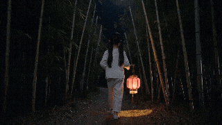 跟随镜头,画面从正后方紧跟小女孩同步移动。她一个人提着灯笼穿过漆黑的竹林小路,灯笼的微弱橘色光只能照亮脚下一小片地面,两侧竹叶被风吹得沙沙作响阴影摇曳,手持感增加不安氛围,东方悬疑恐怖片质感。