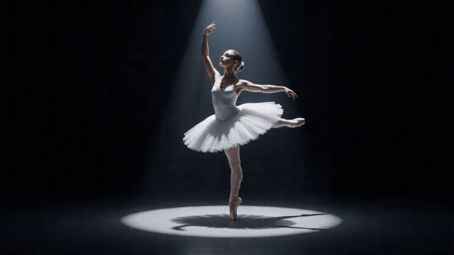 环绕镜头,画面围绕芭蕾舞者做360度匀速弧形旋转。她在聚光灯下单脚立起脚尖做旋转定格姿态,白色纱裙展开如花朵绽放,镜头围绕她缓缓转一整圈,黑色背景只有一束顶光打在她身上,光影在地面画出完美圆形,极简高级感。