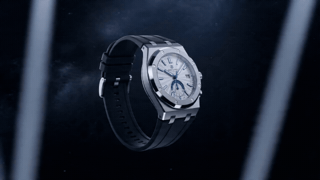 环绕镜头,画面围绕一块机械腕表做360度由慢到快弧形旋转。腕表悬浮在半空中缓缓自转,每转到一个角度都能看到不同的光线在蓝宝石表镜和精钢表壳上折射出新的光斑,背景是纯黑色的深空质感,高端钟表广告风格。