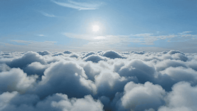 升降镜头,画面从云端高度垂直下降至地面。起初看到的是翻涌的白云和刺眼的阳光,随着高度下降穿破云层露出一片翠绿色的水稻田和蜿蜒的小河,继续下降看到田埂上一个戴斗笠的农民正在弯腰插秧,最终停在与他平视的高度,从壮阔到朴素的反差,田园诗意。
