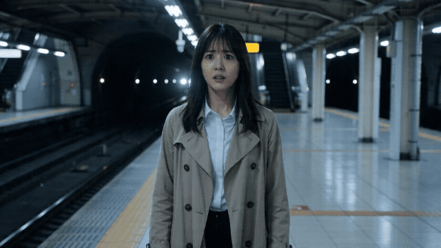 希区柯克变焦效果。女生站在地铁站台上在画面中保持同样大小不变,背景发生强烈的透视拉伸变形。她的表情从愣怔逐渐转为无法置信,身后的地铁隧道延伸好像要把整个世界吸走,荧光灯忽明忽暗,冷白色调混合隧道深处的暗绿,迷失感和不安感。