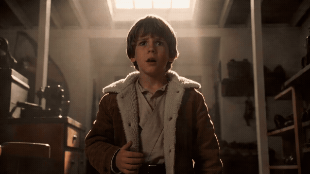 斯皮尔伯格式反应镜头。略微仰拍角度,缓慢推近至小男孩面部特写。他的目光注视着画面上方远处的某个东西(不出现在画面中),表情从好奇缓缓变为无法置信的惊叹,嘴巴越张越大眼睛出现不可思议的眼神,来自他注视方向的温暖金色光线照亮了他的脸,管弦乐渐强的史诗感。