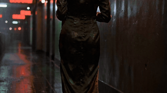 王家卫式影像风格。跟随镜头,画面有轻微晃动和抽帧跳跃感。女人穿着旗袍在深夜的走廊里端着保温壶缓缓走过的身影被慢速呈现,旗袍上的花纹在昏暗的灯光下若隐若现,墙壁被染上红绿霓虹灯的混合色调,颗粒感胶片质感,潮湿的走廊墙面反射着微光,孤独而迷人的都市氛围。