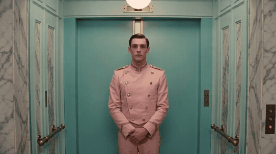 韦斯·安德森式对称构图。固定镜头,画面严格中轴对称。穿粉色制服的电梯服务员面无表情地站在正中央,双手交叠在身前,左右两侧是完全镜像的大理石墙壁和黄铜把手,电梯内部整体色调统一为薄荷绿配奶油白,构图精确工整如同建筑制图,复古而精致的童话酒店感。