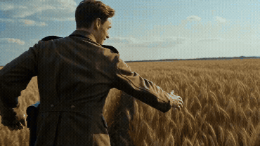 诺兰式时空交叉感。画面在两个时空之间交替呈现:年轻士兵在金黄色调的麦田里奔跑,画面向前推进追随他的背影;切换到同一个人年老后坐在冷蓝色调的病房里缓缓抬起手,画面向后拉远展示整个空荡的房间。两个画面通过他始终伸出的那只手产生关联——年轻时在够麦穗、年老时在够窗外的阳光,时空交错,宿命感。
