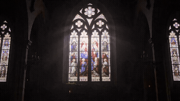 极缓慢的一镜到底漫游。画面以极慢的速度从一间废弃教堂的彩色玻璃窗开始平缓移动,光线透过彩窗在石头地面上投下红蓝紫色的光斑,经过积满灰尘的木质长椅、一根燃到只剩半截的蜡烛正在缓缓熄灭最后的火苗摇曳、石壁上长出的青苔和蕨类植物,远处有微弱的雨水滴落在石板上的回响声,整个画面沉浸在潮湿的弱光中,凝视感,诗意的孤独和时间的重量。