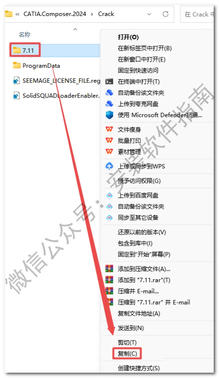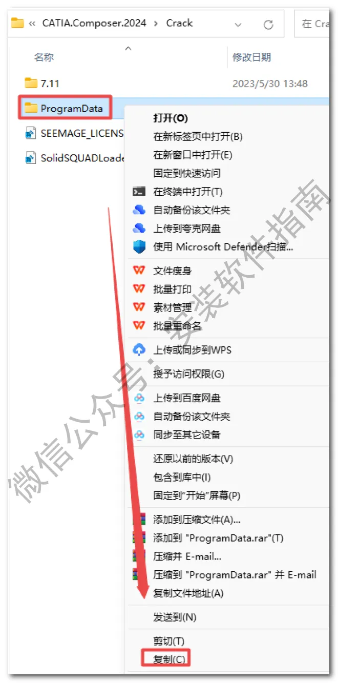 2.打开刚刚解压的文件夹,双击打开“Crack”文件夹,鼠标右键点击“ProgramData”选择“复制”