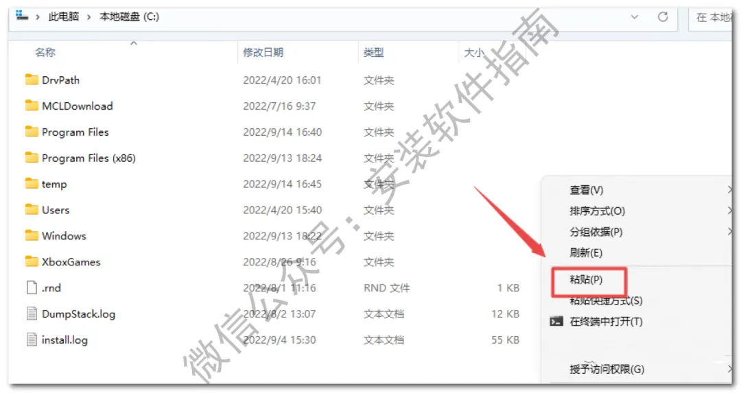 3.打开桌面“此电脑”,打开C盘根目录,在文件夹空白处,鼠标右键“粘贴”刚才复制的“ProgramData”文件夹(若提示替换点击“替换目标中的文件)