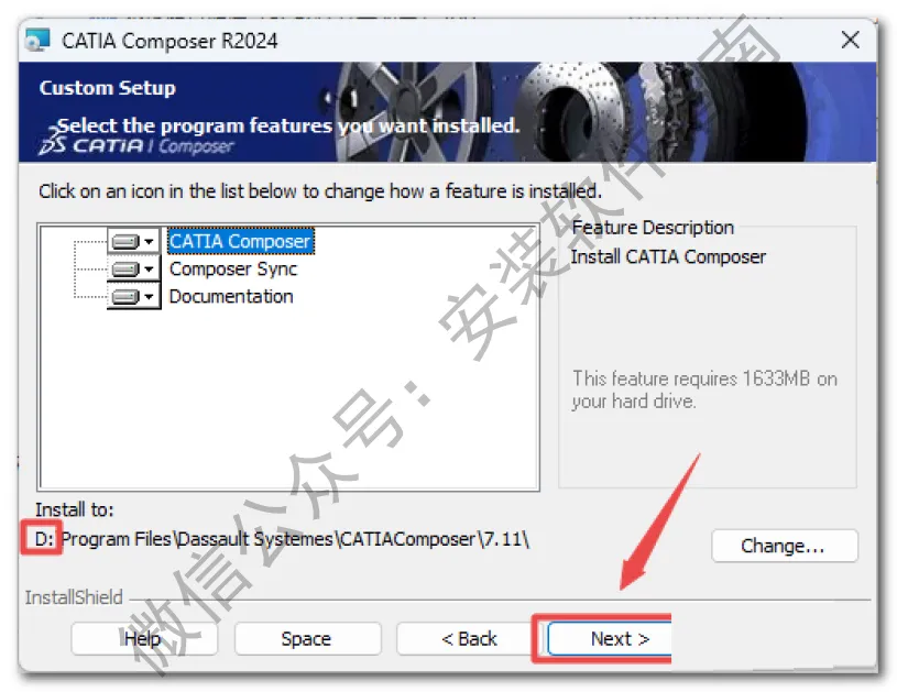 11、选择软件安装路径,建议和教程中的保持一致,本例安装在D盘(将路径地址中的首字符C改为D表示安装到D盘,或者可以在其它磁盘里创建一个新的文件夹,安装路径不要出现中文),点击“Next”