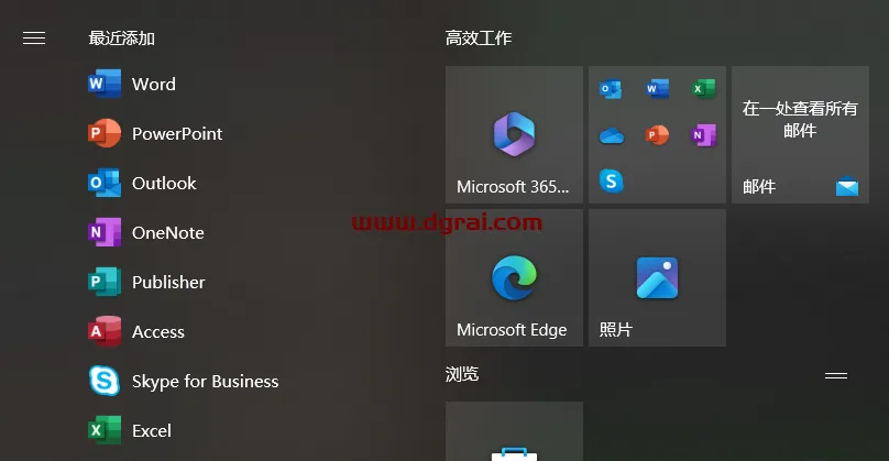 在桌面左下角的开始菜单中,可以看到已安装的 Office 套件的所有组件。