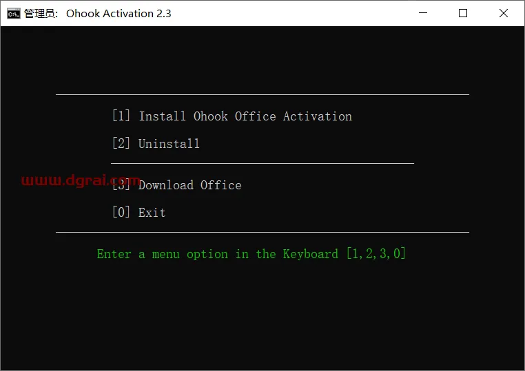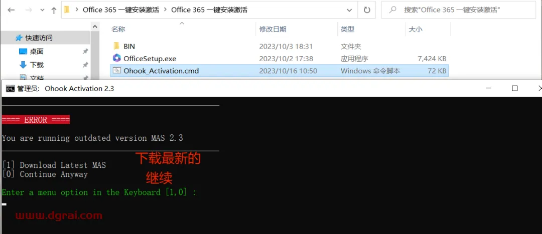 请进入解压后的文件夹,然后双击运行名为”Ohook_Activation.cmd”的文件,这将会弹出一个窗口。会显示你当前电脑运行的MAS是旧版本的,我们当然是选择不更新,继续使用了,直接输入“0”即可。
