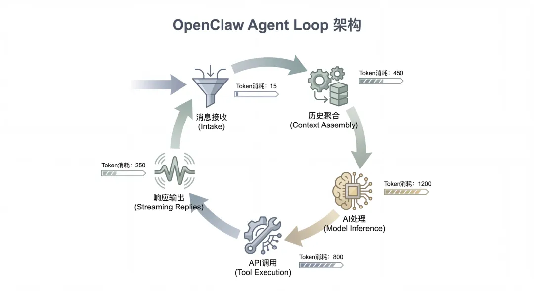 OpenClaw 的运行生命周期包含 5 个核心阶段:入站消息处理(Intake)、上下文组装(Context Assembly)、模型推理(Model Inference)、工具执行(Tool Execution)、流式回复输出(Streaming Replies)。Token 消耗主要发生在前三个阶段。