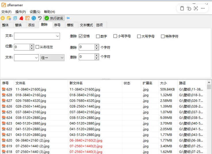 2️⃣.文件批量删除统一内容: 1.切换到"删除"标签页 2.输入要删除的内容 3.可选择删除数字、字母、空格等,查看预览效果 4.点击"执行改名"