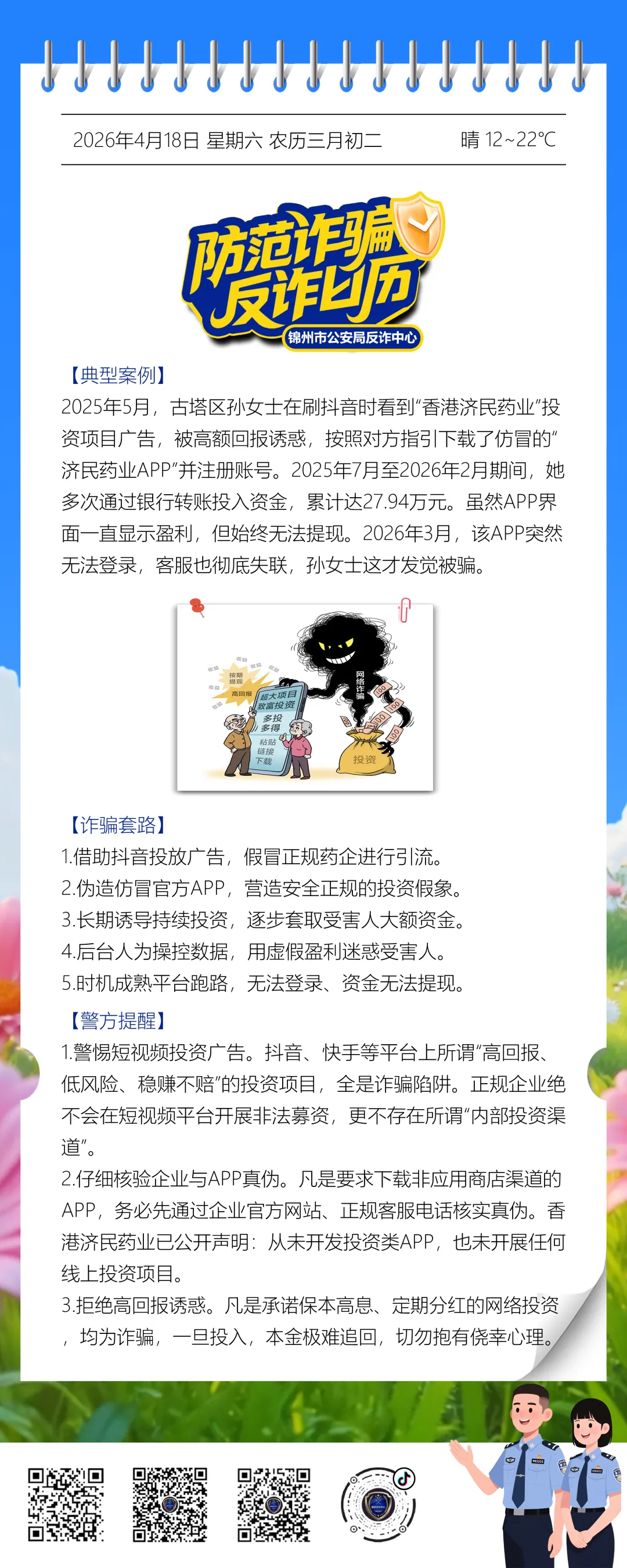 【反诈日历4.18】虚假投资APP长期诱导,古塔区女子投资被骗!