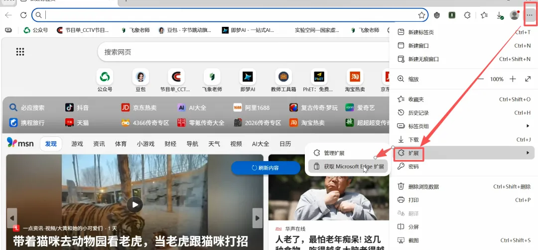 2、点击三个小圆点,在弹出的对话框中选择扩展—获取Microsoft Edge扩展。