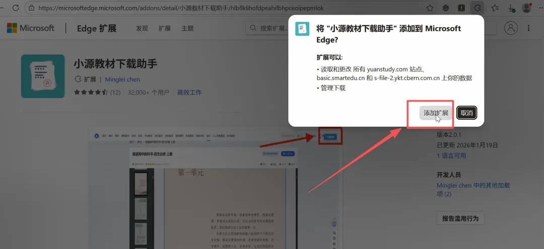6、获取过程中弹出对话框我们选择添加扩展选项。