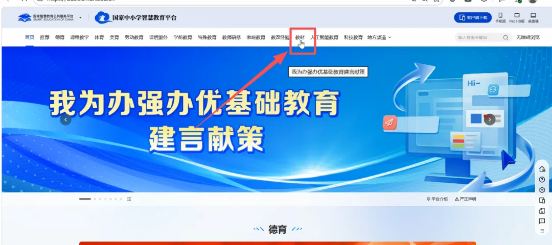 8、打开国家智慧中小学智慧教育平台,点击上方的教材板块进入。