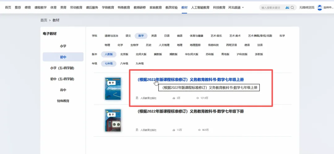 9、我们以人教版初中七年级上册数学教参下载为例,给大家做个下载演示。选中对应教参点击进入。