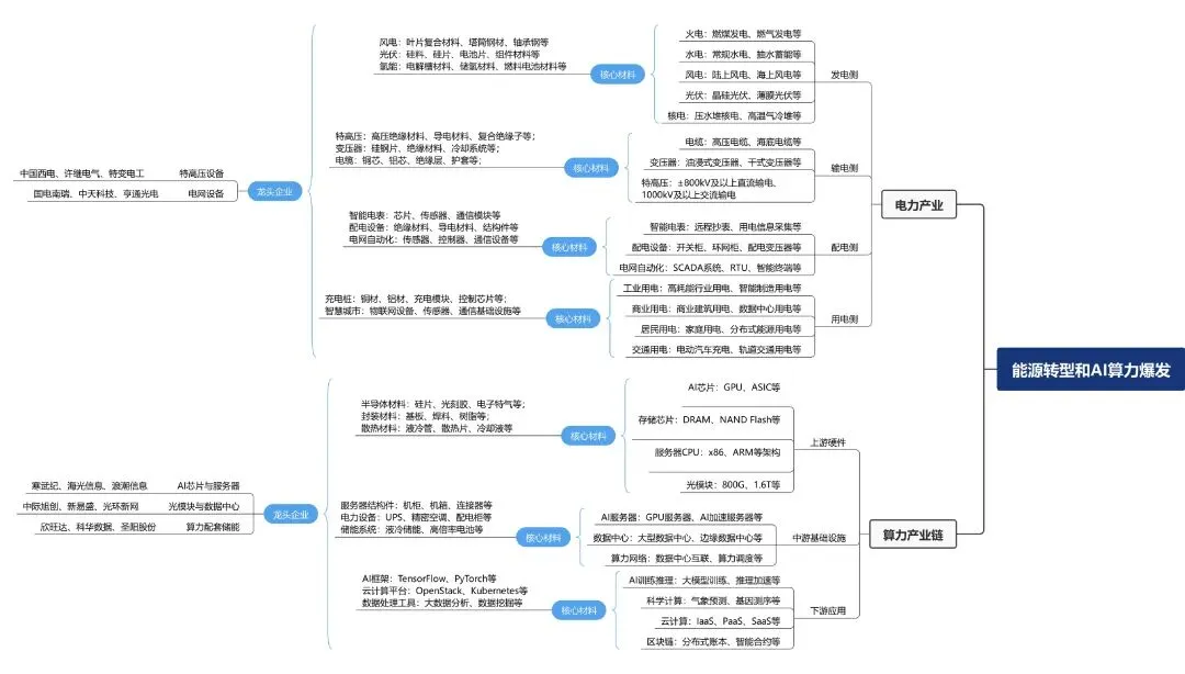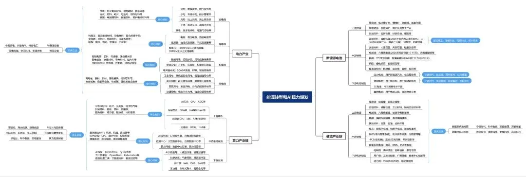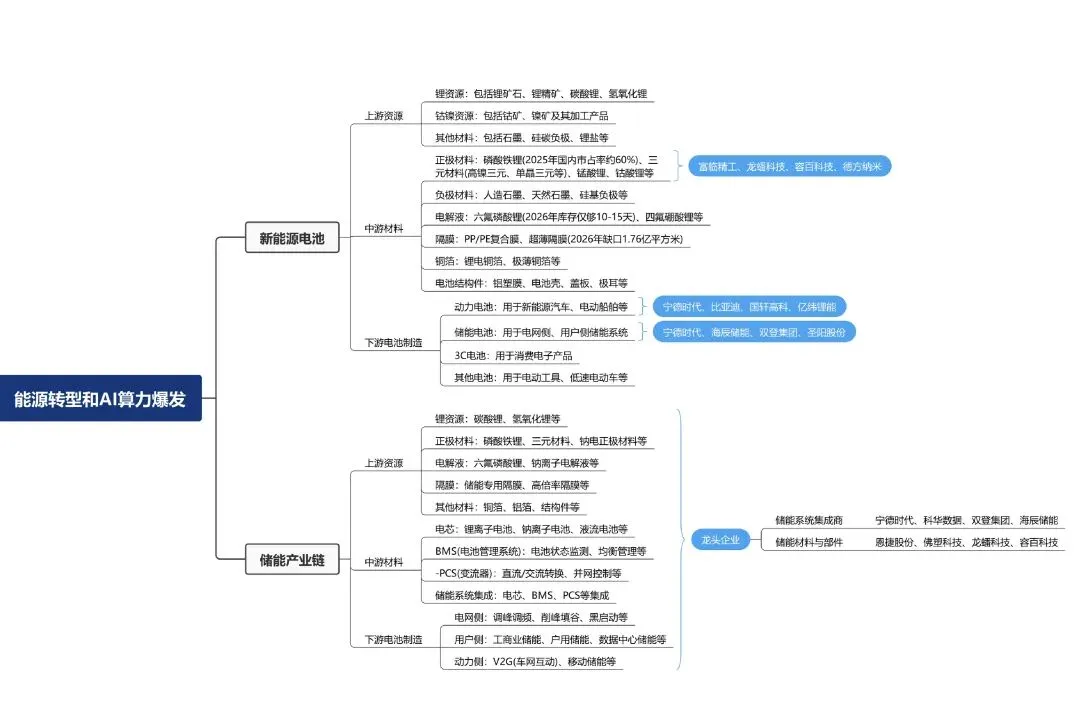 一张图让你看懂新能源电池、产能、电力、算力上下游相关产业。