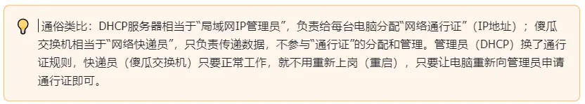 要彻底明白“为什么不用重启傻瓜交换机”,只要搞懂「傻瓜交换机的工作逻辑」和「DHCP的IP分配/续租机制」,就能豁然开朗,再也不盲目操作。