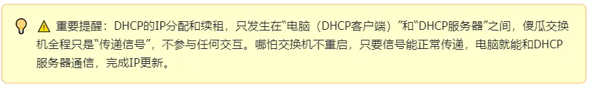 ✅ 核心逻辑:傻瓜交换机只“传数据”,不“管IP分配”,DHCP的IP更新的核心是“电脑与DHCP服务器的交互”,和交换机无关。