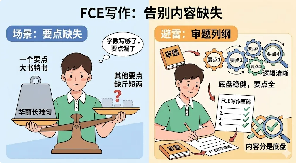 动笔前先审题,把题目要求的要点列在草稿纸上。内容分是FCE写作的“底盘”,底盘不稳,再华丽也是空中楼阁。