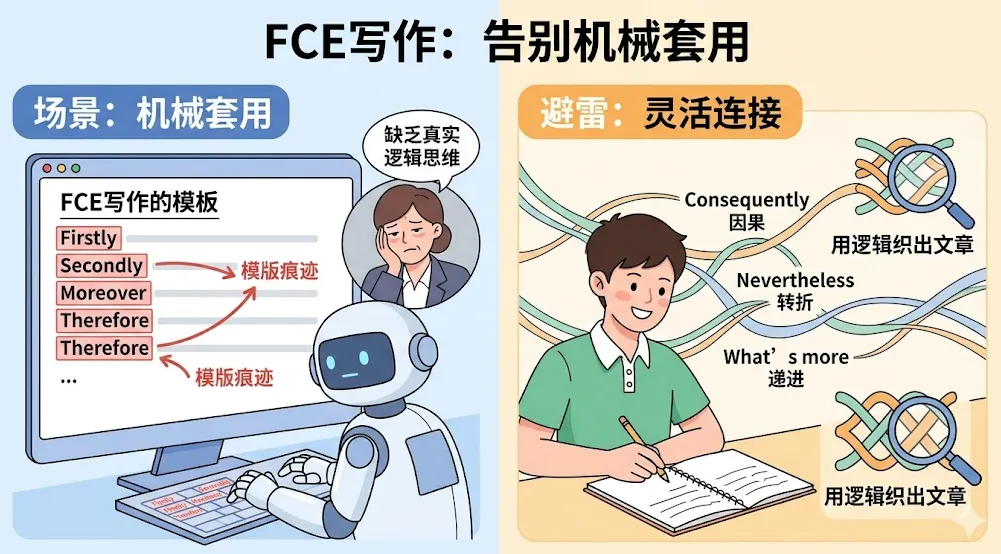 这是最典型的模板痕迹。考官看多了这种机械的FCE写作模板连接词,会觉得孩子缺乏真正的逻辑思维能力。