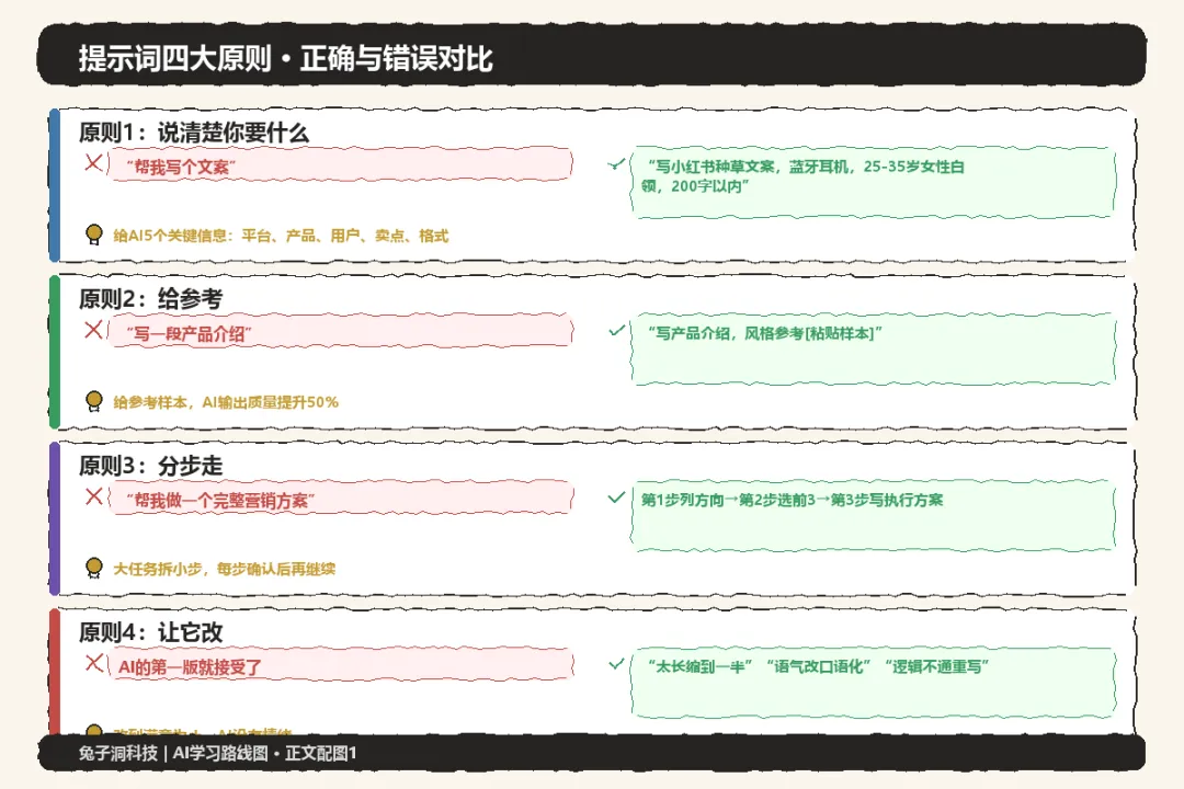 很多人觉得写提示词是"咒语",有什么秘密模板。没有。好的提示词就四条原则: