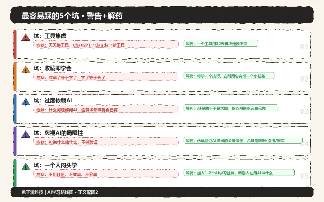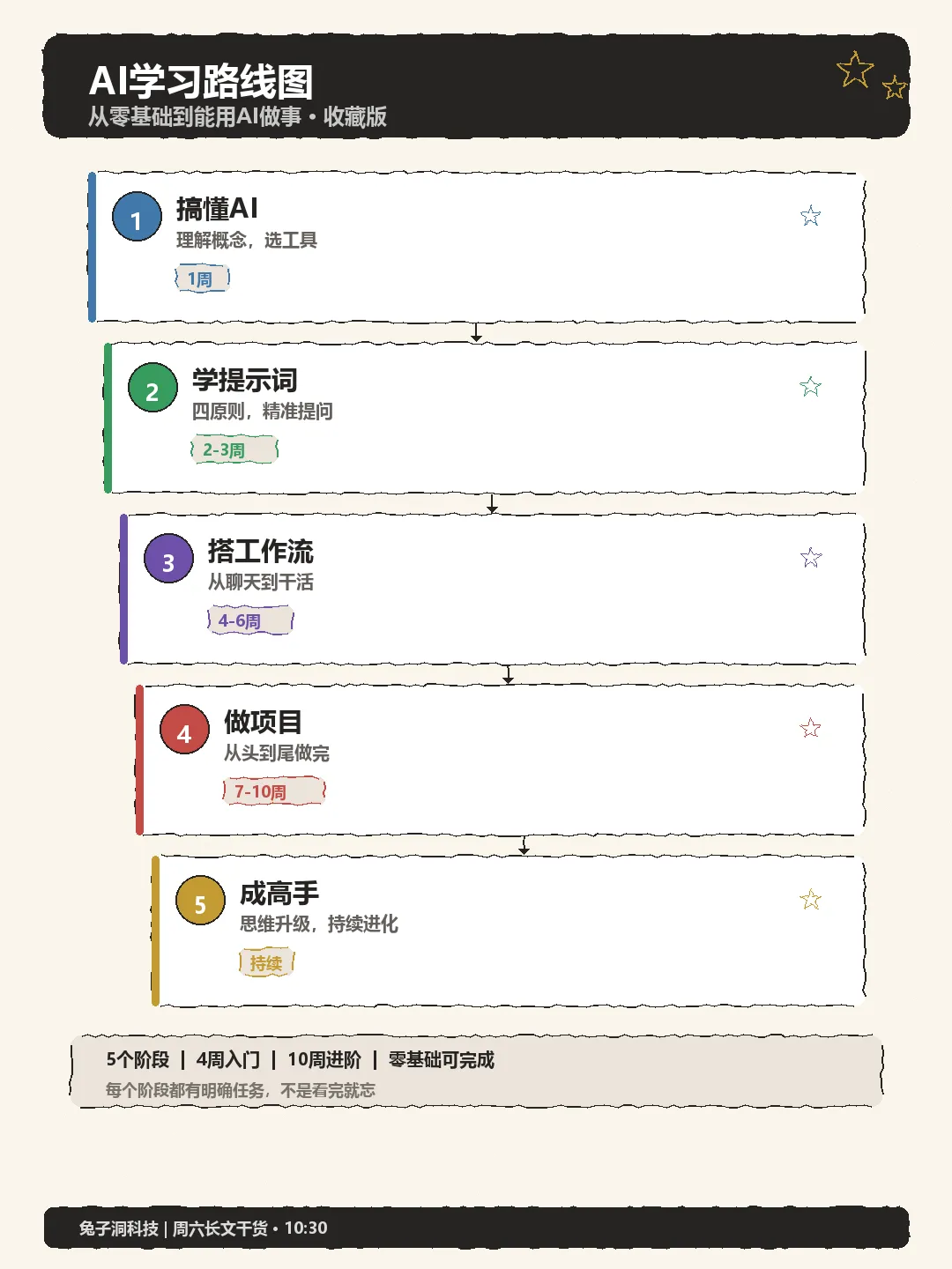 今天这篇文章,不搞信息轰炸,不给100个链接让你自己挑。就一条路,从零到能用AI做事,5个阶段,每一步干什么都给你写清楚了。