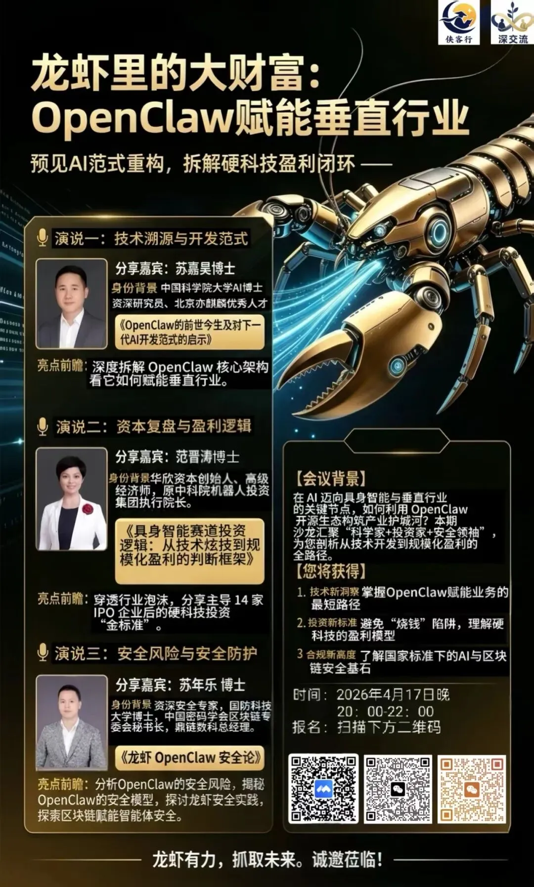 一只“龙虾”里藏着怎样的技术革命与财富密码?当AI迈向具身智能与垂直行业的深水区,OpenClaw开源生态正成为构筑产业护城河的关键抓手。本期沙龙汇聚科学家+投资家+安全领袖,为您深度拆解从技术开发到规模化盈利的全路径。