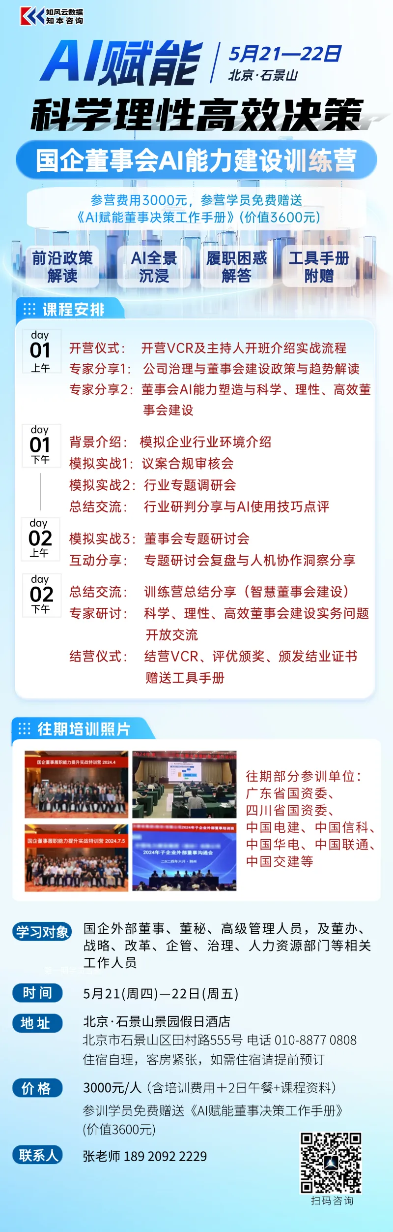 面对监管规范日趋完善、决策场景更趋复杂、数字技术加速迭代的新态势,提升合规履职、科学决策与数字化赋能水平,已成为国企董事的重要方向。为此,知风云数据&知本咨询全新推出国企董事会AI能力提升模拟实战训练营(VCD3.0升级版),聚焦实务能力、实战演练与AI赋能,为国企董事、高管及治理骨干提供系统化、可落地的能力提升支持。