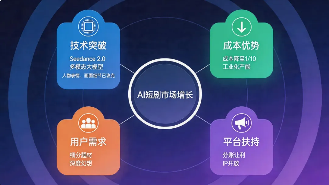 我把AI短剧的驱动力拆成四个维度:技术突破、成本优势、用户需求、平台扶持。