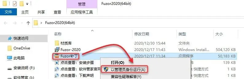 9.双击打开解压后的【Fuzor2020(64bit)】文件夹,鼠标右击【Fuzor补丁】选择【以管理员身份运行】。