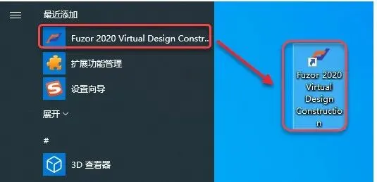 11.创建桌面启动快捷方式:点击桌面左下角【开始】图标,在菜单栏中找到并拖动【Fuzor 2020 Virtual Design Construction】图标到电脑桌面。